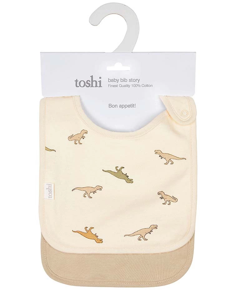 The Toshi Baby Bib Story offers two complimentary bibs of the finest quality 100% cotton knit. The original and exclusive Dinosauria design is featured. Presented harmoniously with this is the Dreamtime certified 100% organic cotton bib in an Almond colour, a natural and earthy gender-neutral hue. The bibs have absorbent cotton padding on the reverse for moisture protection. Conveniently located press studs create adjustable sizing. Toshi bibs are functional, versatile and gentle on delicate skin. Bon appetit!