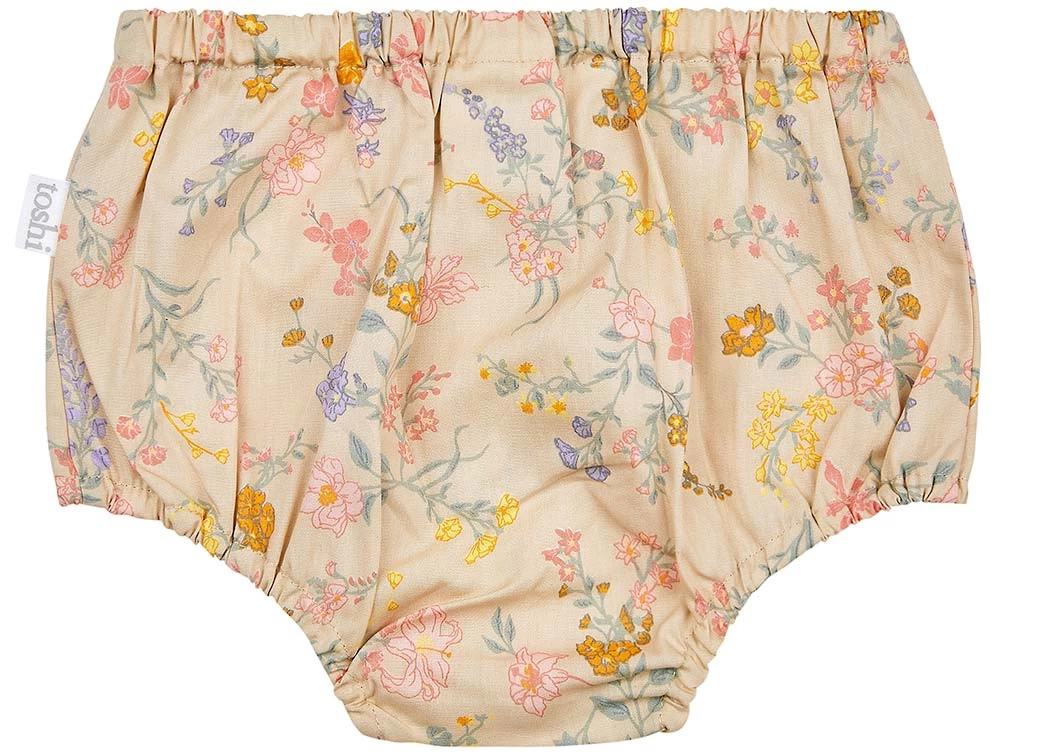 Toshi Baby Bloomers are crafted from the finest quality 100% cotton. Our bloomers are designed for comfort and mobility during little adventures and moments of vigorous play. The elasticised waist offers ease of dressing and convenient nappy changes. Baby Bloomers Isabelle Almond presents in an original and exclusive Toshi design, featuring delicately hand illustrated fresh spring blossoms in an earthy hue.