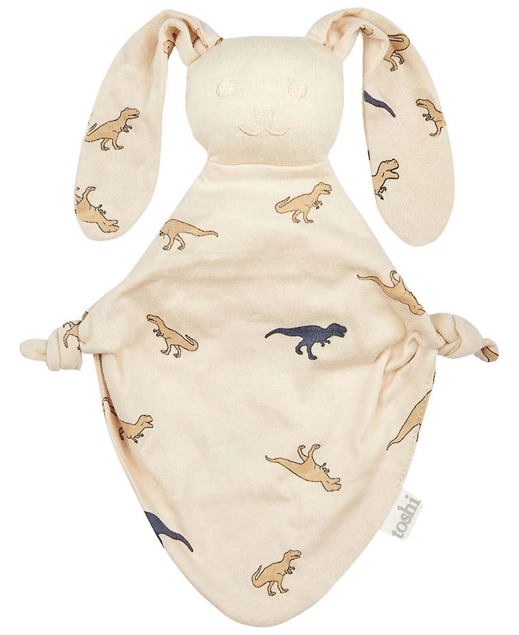 Toshi Bunny Jumbo is an ideal sleep comforter and daytime playmate. The lightweight feel makes bunny a suitable companion for indoor and outdoor adventures. Made from the finest quality 100% cotton, bunny is gentle and soothing to hold. Bunny Jumbo Dinosauria presents in an original and exclusive Toshi design, featuring majestic dinosaurs of the wilds in a gender-neutral and earthy hue.