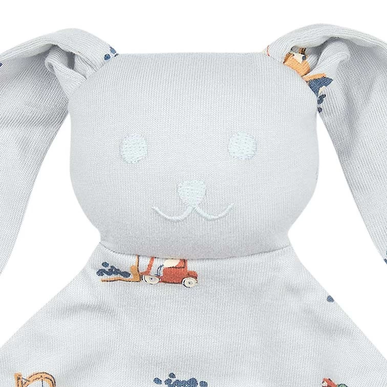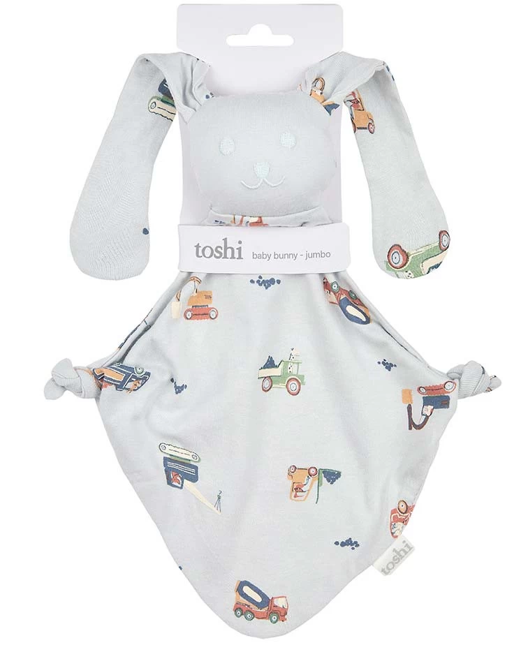 Toshi Bunny Jumbo is an ideal sleep comforter and daytime playmate. The lightweight feel makes bunny a suitable companion for indoor and outdoor adventures. Made from the finest quality 100% cotton, bunny is gentle and soothing to hold. Bunny Jumbo Little Diggers presents in an original and exclusive Toshi design, featuring an exciting collection of construction vehicles in a soft baby blue hue.