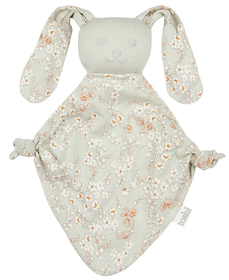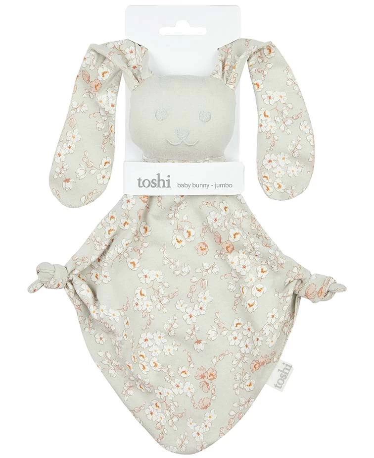 Toshi Bunny Jumbo is an ideal sleep comforter and daytime playmate. The lightweight feel makes bunny a suitable companion for indoor and outdoor adventures. Made from the finest quality 100% cotton, bunny is gentle and soothing to hold. Bunny Jumbo Stephanie presents in an original and exclusive Toshi design, featuring delicate and finely illustrated blossoms in a soft green hue.