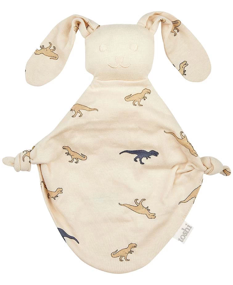 Toshi Bunny Mini is an ideal sleep comforter and daytime playmate. The lightweight feel makes bunny a suitable companion for indoor and outdoor adventures. Made from the finest quality 100% cotton, bunny is gentle and soothing to hold. Bunny Mini Dinosauria presents in an original and exclusive Toshi design, featuring majestic dinosaurs of the wilds in a gender-neutral and earthy hue.