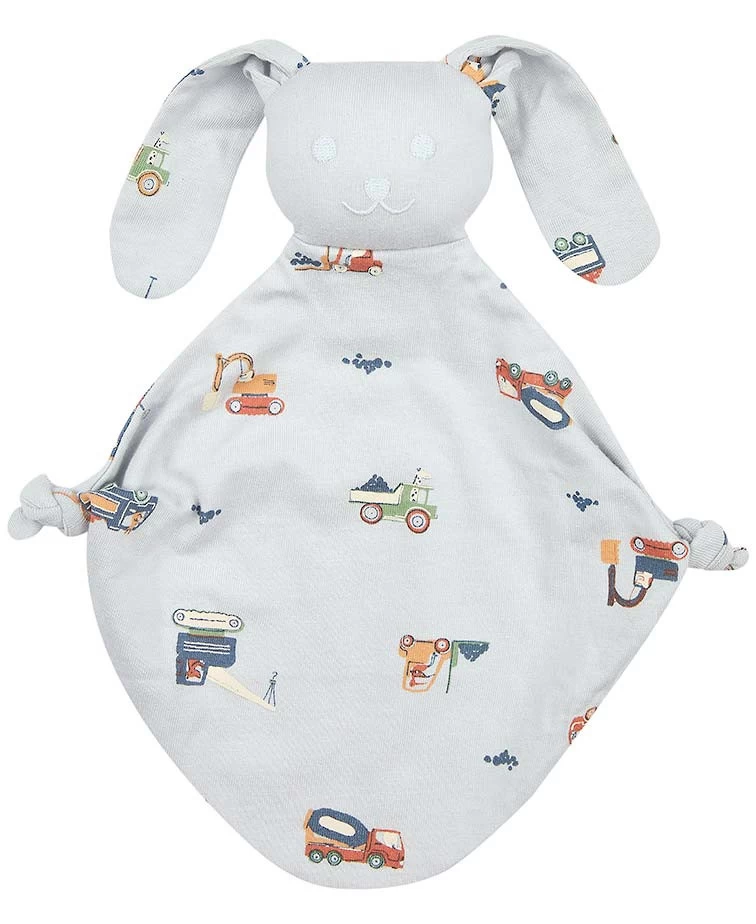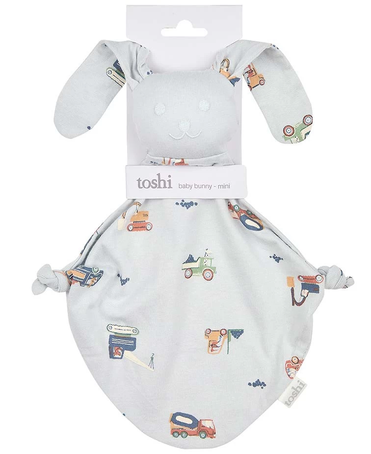 Toshi Bunny Mini is an ideal sleep comforter and daytime playmate. The lightweight feel makes bunny a suitable companion for indoor and outdoor adventures. Made from the finest quality 100% cotton, bunny is gentle and soothing to hold. Bunny Mini Little Diggers presents in an original and exclusive Toshi design, featuring an exciting collection of construction vehicles in a soft baby blue hue.