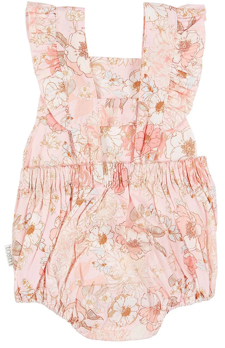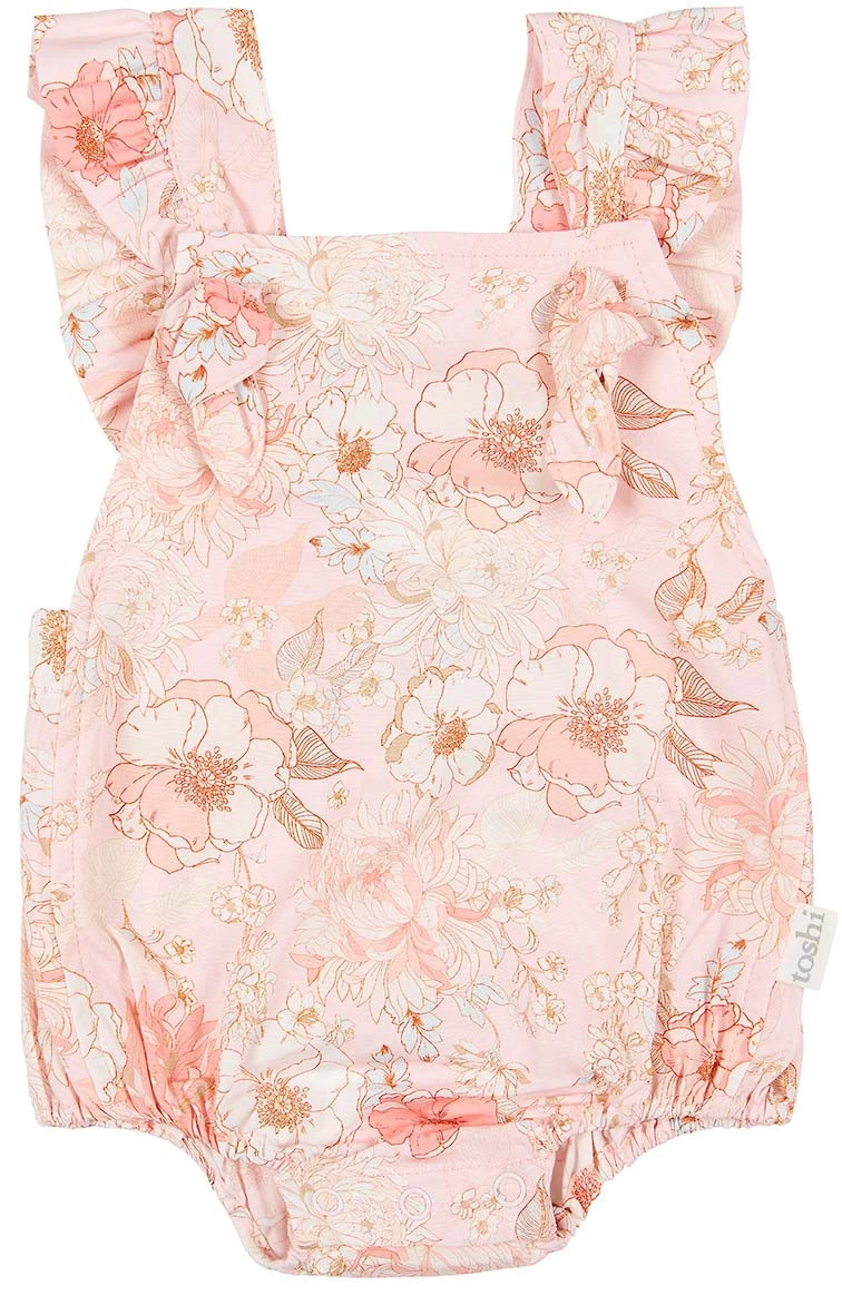The Toshi Baby Romper is reminiscent of bygone days and is the perfect look for a fun summer occasion. Flattering frills create a pretty, feminine style and the open back is light and playful. The romper has shoulder ties for adjustable sizing and convenient dressing. Elasticised waistband and leg openings offer greater flexibility for a snug fit. Press studs create convenient nappy changes. Romper Sabrina Blush features a bold vintage floral design in a dusty pink colour palette.