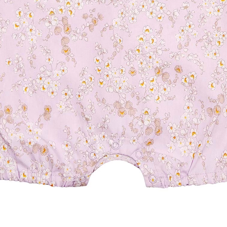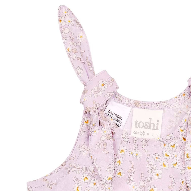 The Toshi Baby Romper is reminiscent of bygone days and is the perfect look for an endless summer. With a loose, casual fit, the romper is ideal for relaxed play. The Toshi Romper has shoulder ties for adjustable sizing and convenient dressing. Press studs create convenient nappy changes. Baby Romper Stephanie Lavender presents in an original and exclusive Toshi design, featuring delicate and finely illustrated blossoms in a pretty lilac hue.