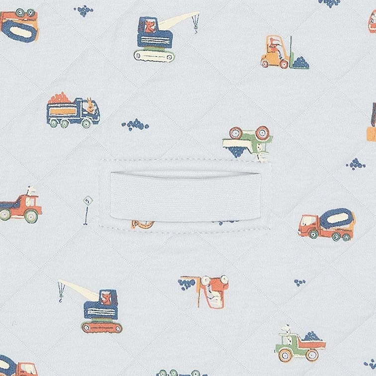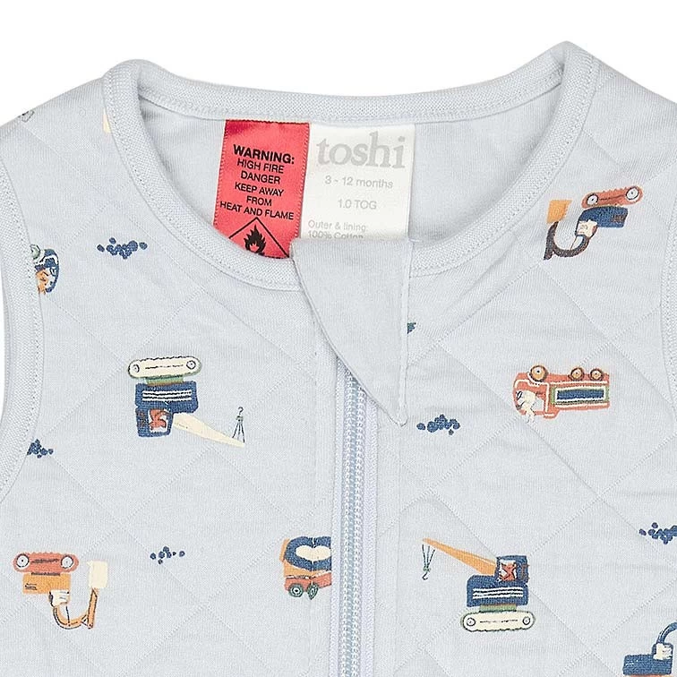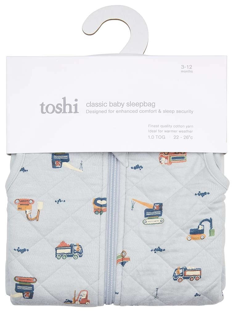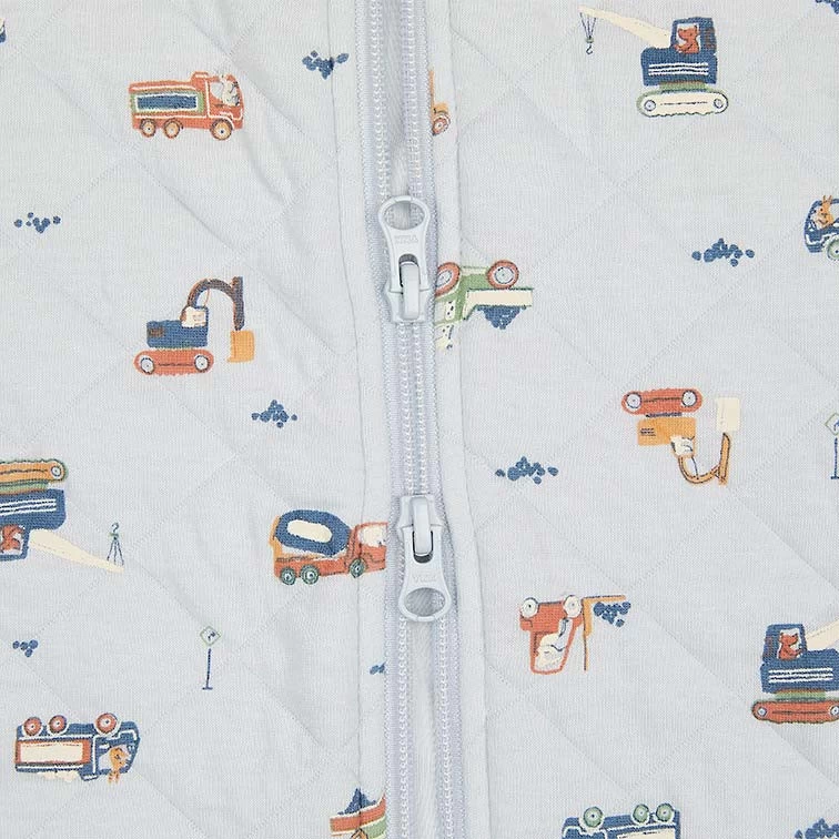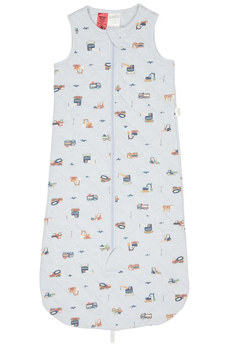Sleep Bag Little Diggers presents in an original and exclusive Toshi design, featuring an exciting collection of construction vehicles in a soft baby blue hue.