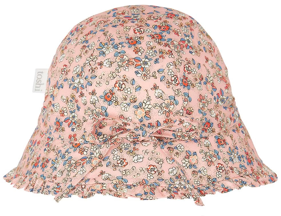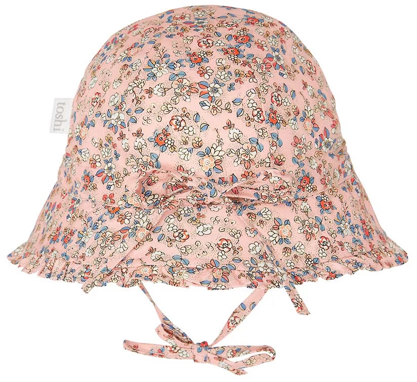 Toshi Bell Hat Libby is a flattering and feminine bell shaped hat. The baby sunhat is crafted from the finest quality 100% cotton. The head tie offers adjustable sizing and a chin tie secures the hat. The sunhat is fully lined for increased comfort. Pretty styling is created with a softly frilled border. Toshi Bell Hat Libby Blush features a delicate and petite vintage inspired floral design, in a sweet pink hue.