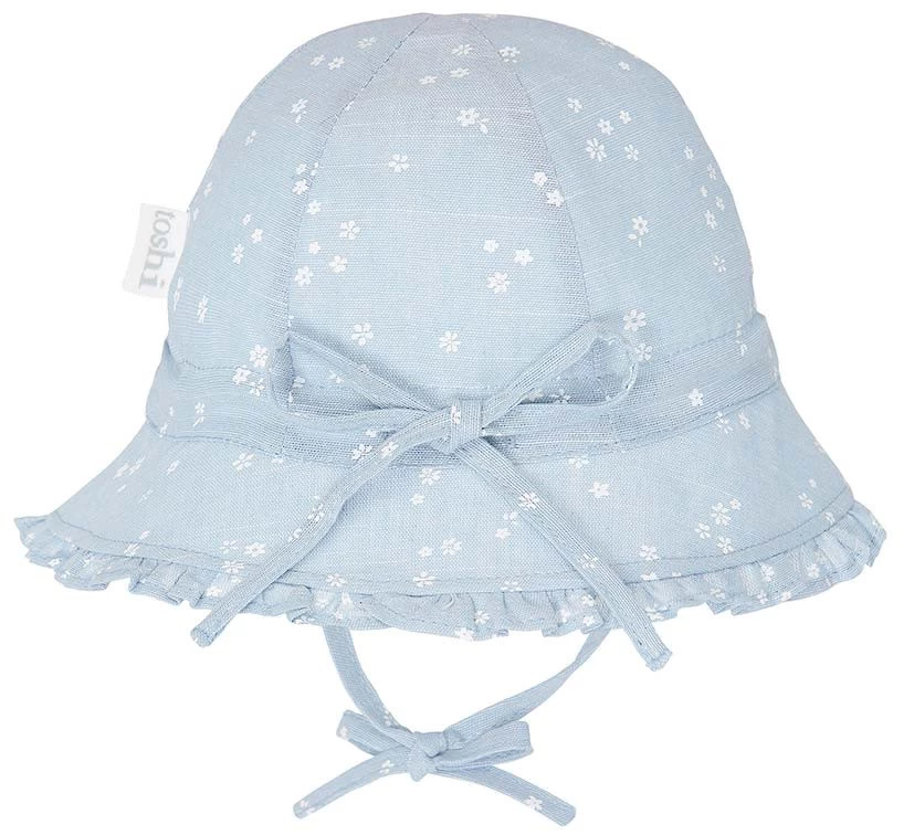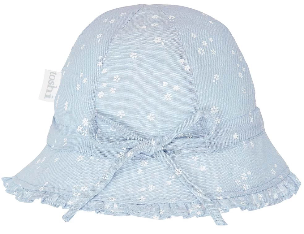 Toshi Bell Hat Milly is a flattering and feminine bell shaped hat. The baby sunhat is crafted from the finest quality 100% cotton. The head tie offers adjustable sizing and a chin tie secures the hat. The sunhat is fully lined for increased comfort. Pretty styling is created with a softly frilled border. Toshi Bell Hat Milly Sky features a classically subtle floral design in a baby blue hue.
