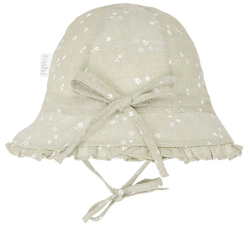 Toshi Bell Hat Milly is a flattering and feminine bell shaped hat. The baby sunhat is crafted from the finest quality 100% cotton. The head tie offers adjustable sizing and a chin tie secures the hat. The sunhat is fully lined for increased comfort. Pretty styling is created with a softly frilled border. Toshi Bell Hat Milly Thyme features a classically subtle floral design in a botanically inspired green hue.