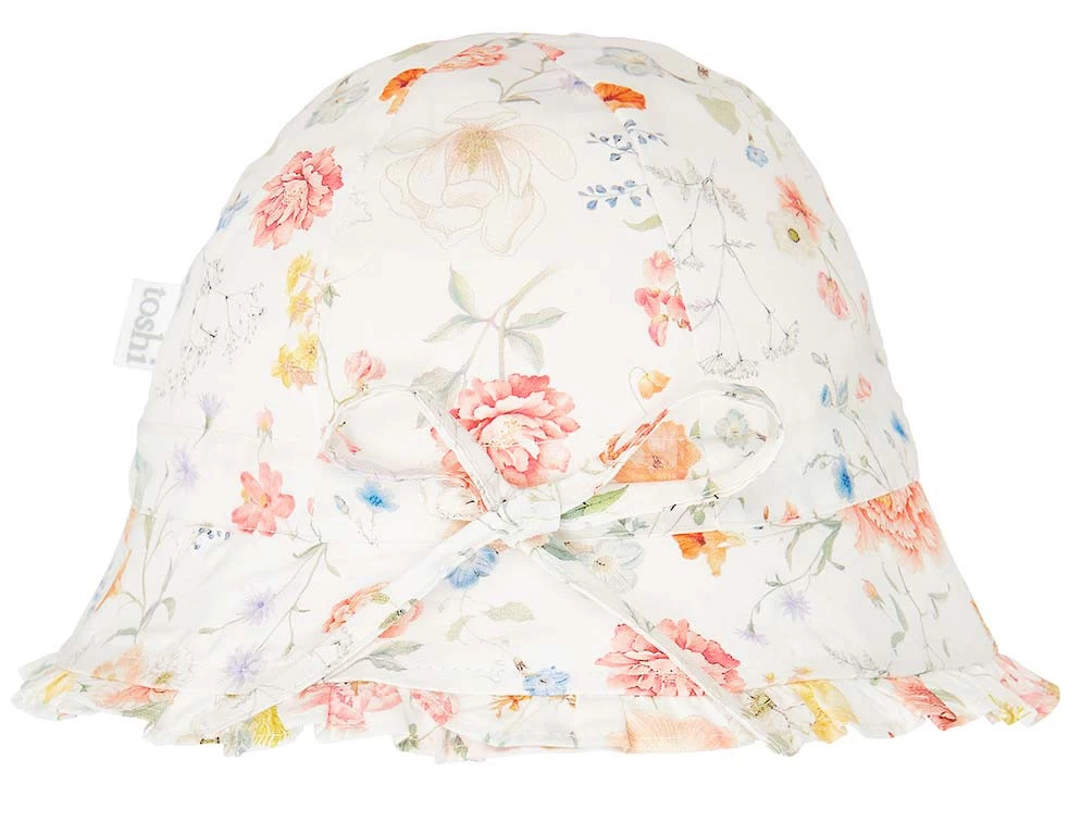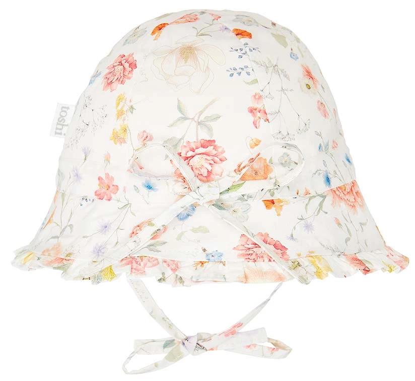 Toshi Bell Hat Secret Garden is a flattering and feminine bell shaped hat. The baby sunhat is crafted from the finest quality 100% cotton. The head tie offers adjustable sizing and a chin tie secures the hat. The sunhat is fully lined for increased comfort. Pretty styling is created with a softly frilled border. Toshi Bell Hat Secret Garden Lilly features a delicate abundance of sweetly curated field flowers.