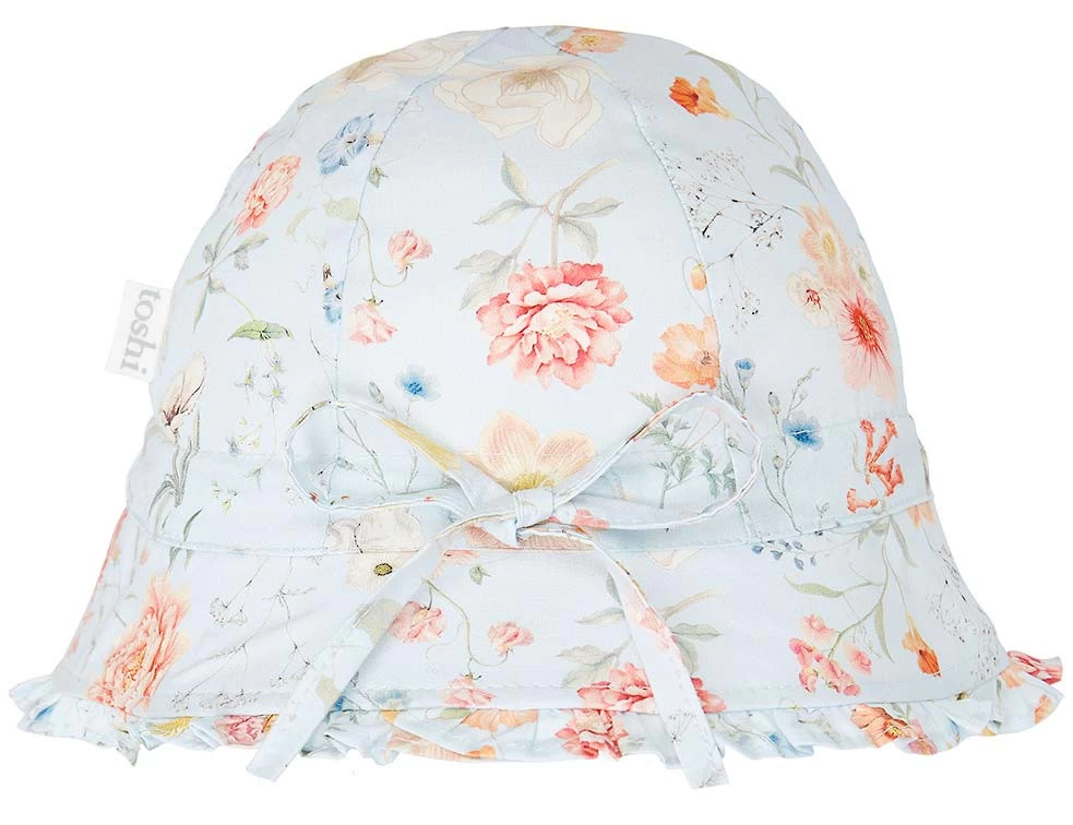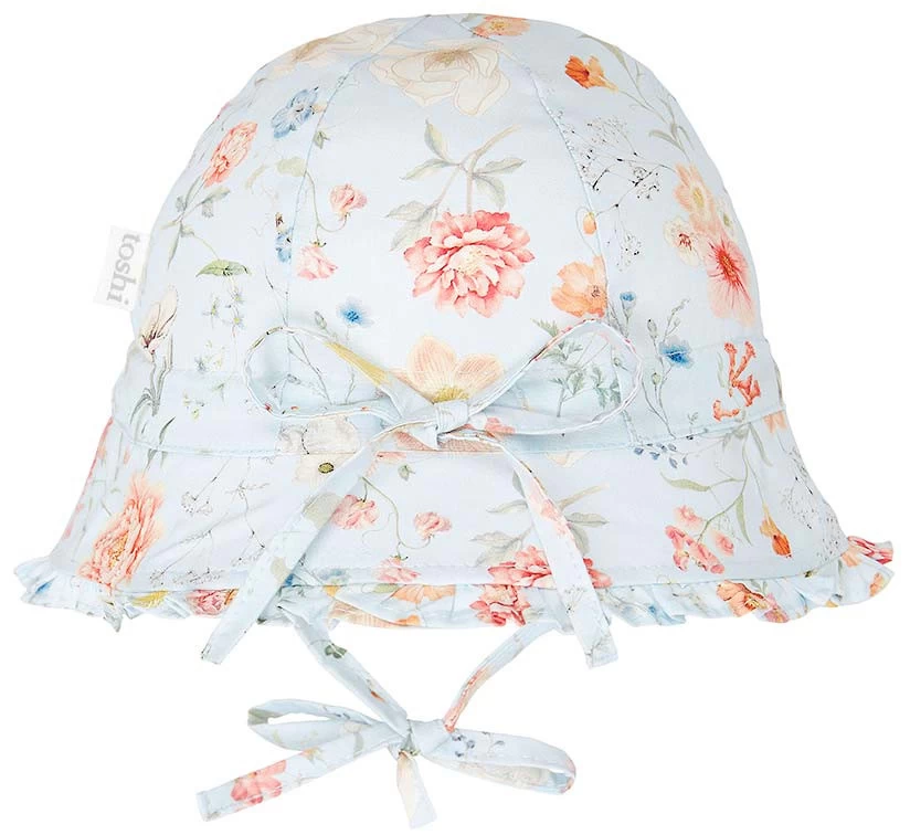 Toshi Bell Hat Secret Garden is a flattering and feminine bell shaped hat. The baby sunhat is crafted from the finest quality 100% cotton. The head tie offers adjustable sizing and a chin tie secures the hat. The sunhat is fully lined for increased comfort. Pretty styling is created with a softly frilled border. Toshi Bell Hat Secret Garden Sky features a delicate abundance of sweetly curated field flowers in a soft blue colourway.