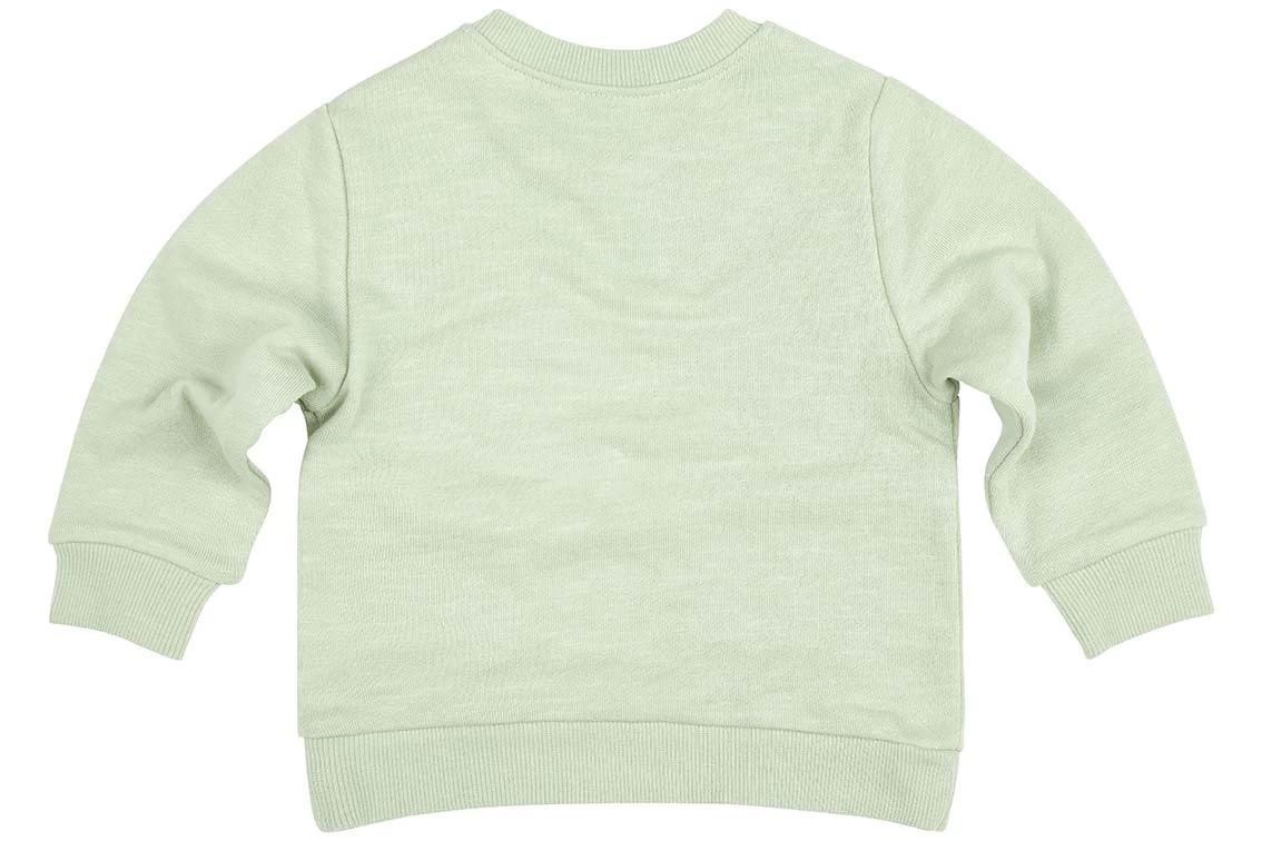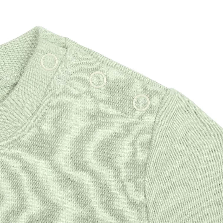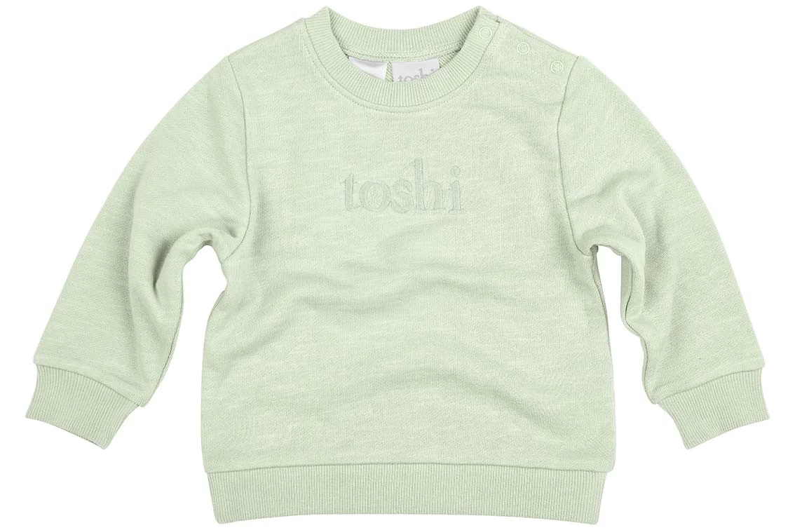 The Organic Sweater and Tracksuit collection features a subtly textured marle colour palette and the colour of this sweater is Jade, a gentle green and gender-neutral hue.
