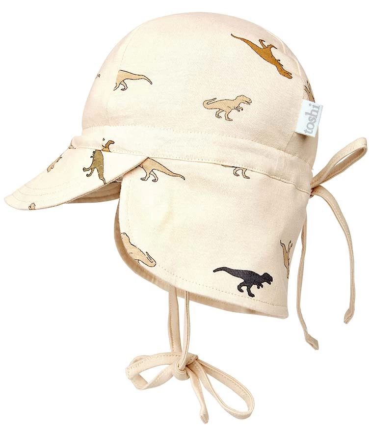 The Toshi Flap Cap Bambini is the ideal baby sunhat. Shading precious babies from the elements is the priority and our flap cap has a contoured neck flap for enhanced sun protection. A head tie creates adjustable sizing and the chin tie secures the cap. Made from the finest quality 100% cotton knit, the baby sunhat is gentle to wear, functional and practical. The cap is fully lined for increased comfort. Flap Cap Bambini Dinosauria features in an original and exclusive Toshi design, featuring majestic dinosaurs of the wilds in a gender-neutral and earthy hue.