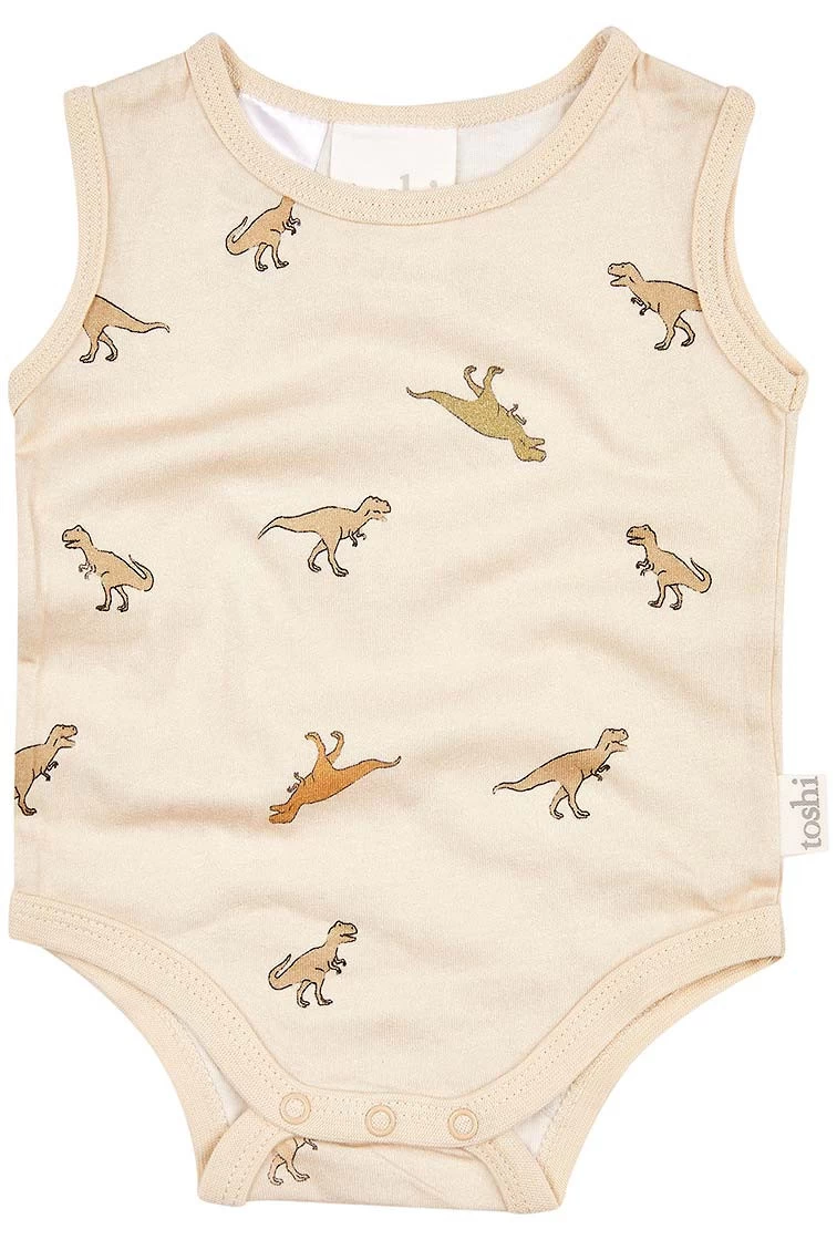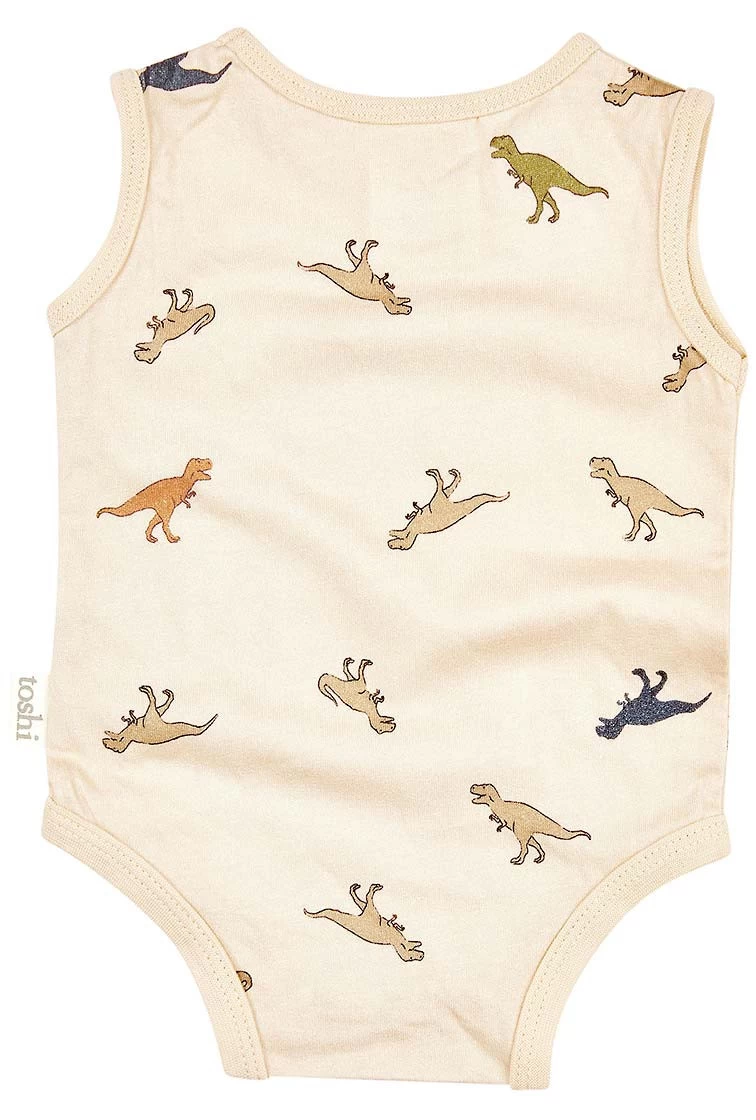 Onesie Singlet Dinosauria presents in an original and exclusive Toshi design, featuring majestic dinosaurs of the wilds in a gender-neutral and earthy hue.