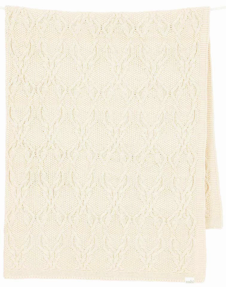 The sumptuously soft Toshi Organic Baby Blanket Bowie has a hand crafted feel and features a beautifully textured cable knit design. The finest quality certified 100% organic cotton yarn is as gentle on your baby’s delicate skin as it is on our precious environment. Melange yarn offers a level of refinement to this sophisticated Toshi baby accessory. The colour of this blanket is Feather, a natural and earthy gender-neutral hue. The Toshi baby blanket measures 90 x 110cm.