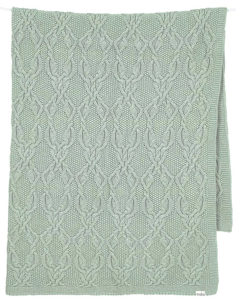 The sumptuously soft Toshi Organic Baby Blanket Bowie has a hand crafted feel and features a beautifully textured cable knit design. The finest quality certified 100% organic cotton yarn is as gentle on your baby’s delicate skin as it is on our precious environment. Melange yarn offers a level of refinement to this sophisticated Toshi baby accessory. The colour of this blanket is Jade, a versatile and classic gender-neutral green hue. The Toshi baby blanket measures 90 x 110cm.