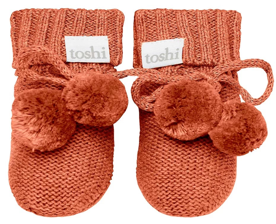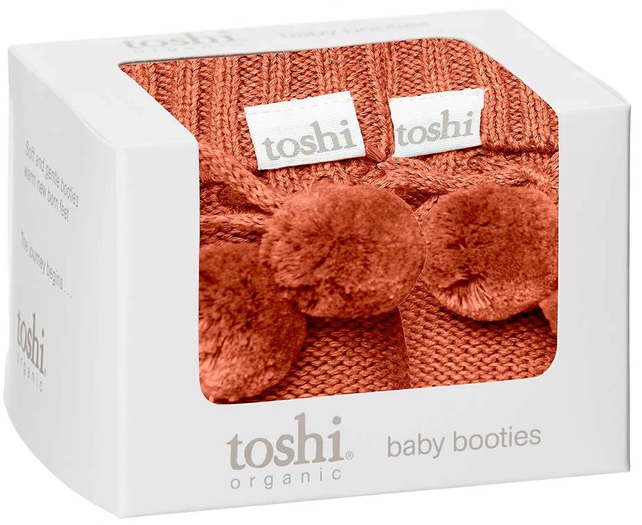 The much loved Toshi Organic Baby Booties Marley are made from the finest quality certified 100% organic cotton yarn. Organic certification ensures the booties are gentle on your babies delicate feet, as well as the environment. The beautifully-textured melange yarn brings an element of refinement to this Toshi baby accessory. Carefully crafted with a ribbed knit cuff, Toshi booties stay up while maintaining healthy circulation. Our booties are ankle height and are designed to protect precious tootsies during rest and play. Cute pom poms create a whimsical style and the ties ensure a snug fit. The colour of this pair of booties is Saffron, a deep and warm gender-neutral hue of the moment. Toshi booties are packaged in a quality box and make an ideal newborn gift.