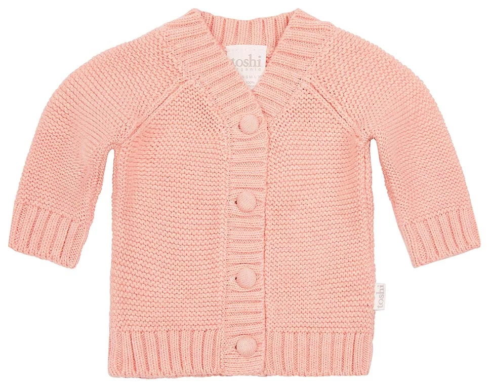The sumptuously soft Toshi Organic Baby Cardigan Andy is crafted from the finest quality certified 100% organic cotton yarn. Organic certification ensures the cardigan is gentle on your delicate baby, as well as our precious environment. A melange yarn offers a level of refinement to this cosy and nurturing Toshi baby accessory. With a textured reverse knit and covered buttons, the styling is classic and yet the feel is contemporary. Cardigan Andy is designed to keep precious babies warm and cosy during our cooler months. The colour of this cardigan is Blossom, a delightfully pretty pink hue.