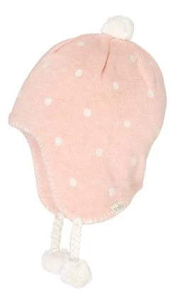 Toshi Earmuff Magic Peony is crafted from the finest quality certified 100% organic cotton yarn. Organic certification ensures the beanie is gentle on heads, as well as our precious environment. The beautifully-textured melange yarn brings an element of refinement to the beanie. This beanie features ear flaps for cosy and nurturing protection from the elements. A vibrant jacquard polka dot design creates a fun and playful style. This beanie colour is a pretty pink with classic cream polka dots. Pom poms introduce a cute and whimsical feel. The baby beanie Earmuff Magic Peony is fully lined for enhanced comfort and greater warmth during our cooler months.