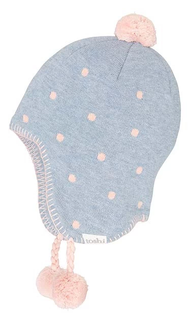 Toshi Earmuff Magic Tide is crafted from the finest quality certified 100% organic cotton yarn. Organic certification ensures the beanie is gentle on heads, as well as our precious environment. The beautifully-textured melange yarn brings an element of refinement to the beanie. This beanie features ear flaps for cosy and nurturing protection from the elements. A vibrant jacquard polka dot design creates a fun and playful style. This beanie colour is a gentle blue with pretty pink polka dots. Pom poms introduce a cute and whimsical feel. The baby beanie Earmuff Magic Tide is fully lined for enhanced comfort and greater warmth during our cooler months.