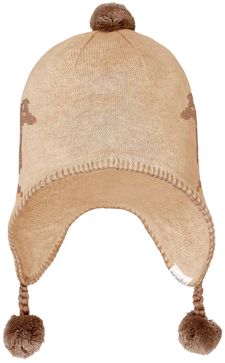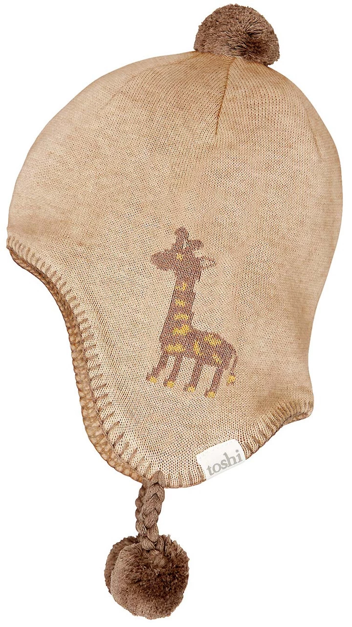 Toshi Earmuff Storytime Mr Giraffe is crafted from the finest quality certified 100% organic cotton yarn. Organic certification ensures the beanie is gentle on heads, as well as our precious environment. The beautifully textured melange yarn brings an element of refinement to the beanie. This beanie features ear flaps for cosy and nurturing protection from the elements. A jacquard giraffe design creates a hat made for little adventures! Pom poms introduce a cute and playful look. The baby beanie Earmuff Storytime Mr Giraffe is fully lined for enhanced comfort and greater warmth during our cooler months.