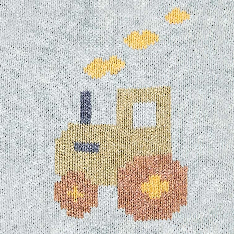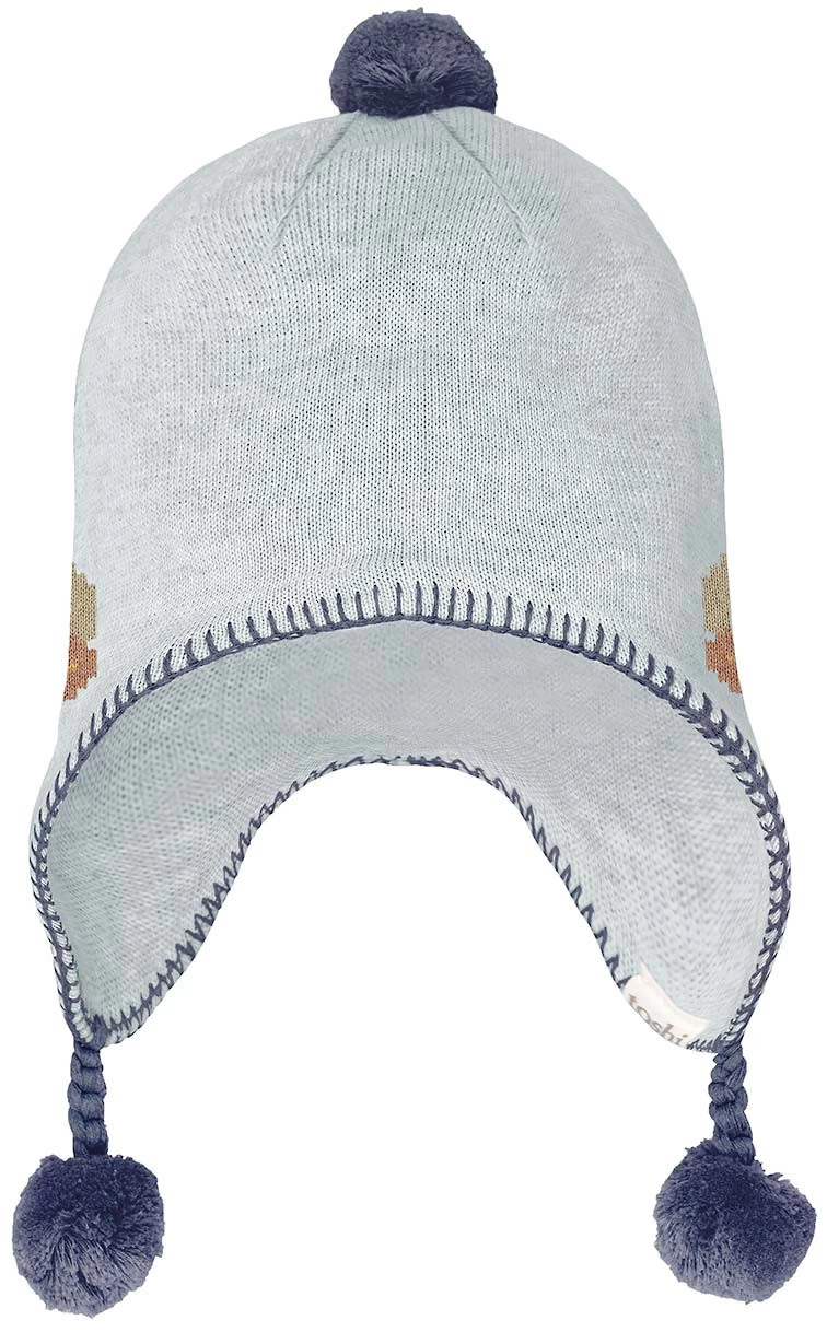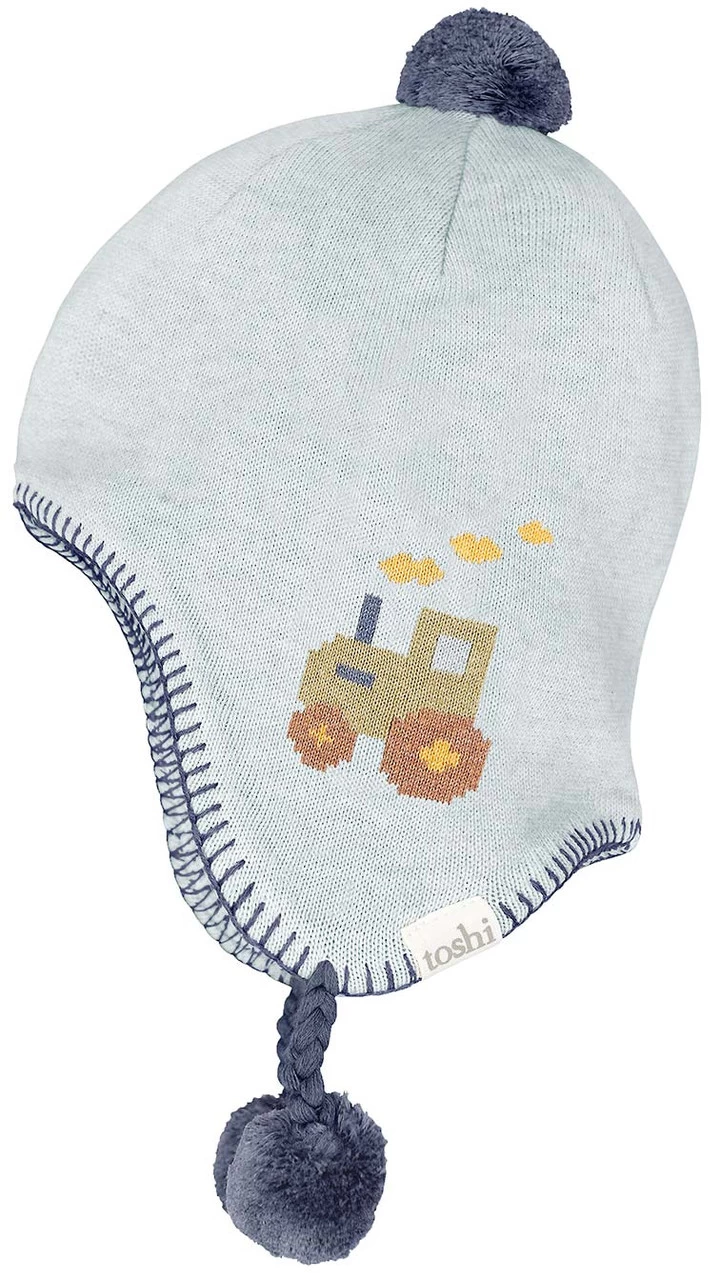 Toshi Earmuff Storytime Mr Tractor is crafted from the finest quality certified 100% organic cotton yarn. Organic certification ensures the beanie is gentle on heads, as well as our precious environment. The beautifully textured melange yarn brings an element of refinement to the beanie. This beanie features ear flaps for cosy and nurturing protection from the elements. A jacquard Tractor design creates a hat made for little adventures! Pom poms introduce a cute and playful look. The baby beanie Earmuff Storytime Mr Tractor is fully lined for enhanced comfort and greater warmth during our cooler months.