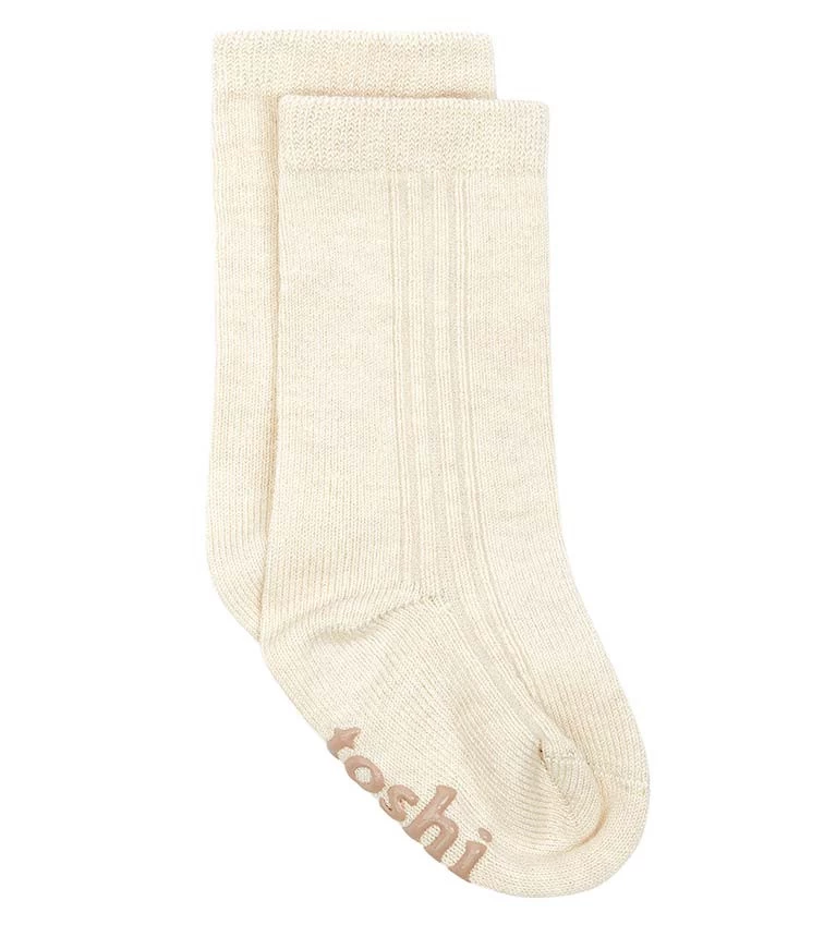 The Toshi sock toe is hand linked, a quality crafting technique that enhances comfort for baby feet. Baby safety is supported with a skid resistant sole grip for all sizes . Toshi socks stay up while maintaining healthy circulation. Our socks sit at knee height. Adorn your baby’s feet with a sophisticated colour palette, refined design and intelligent functionality.