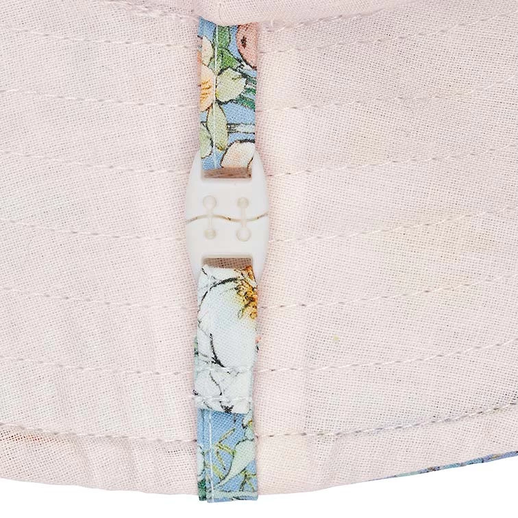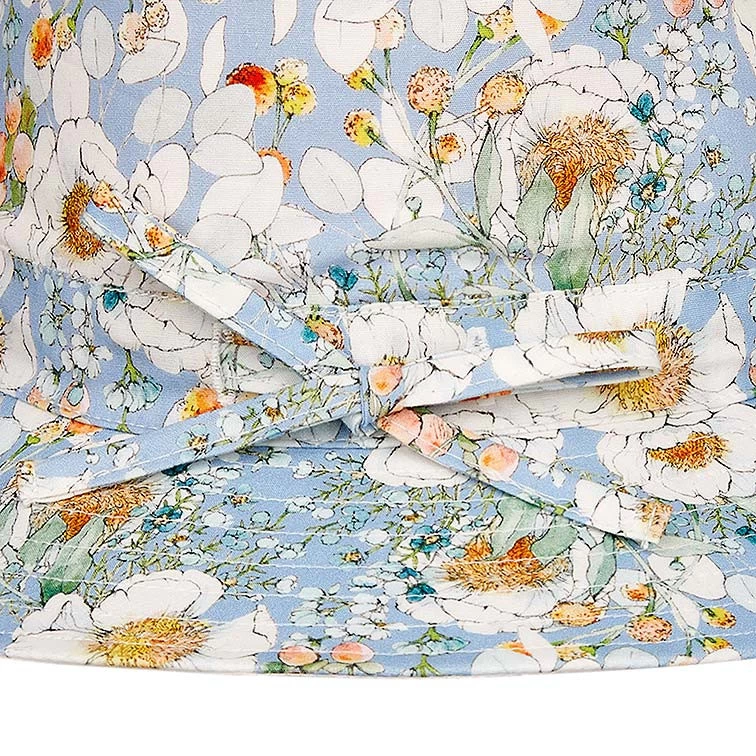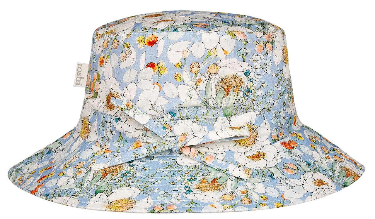 Toshi presents the classic Sunhat Claire, an ideal sunhat for children of all ages. The broad and well-structured brim offers increased sun protection. A head tie creates adjustable sizing and the chin tie with toggle secures the hat and offers ease of wear. The security release clasp on the chin tie is designed to enhance wearer safety. Sunhat Claire is crafted from the finest quality 100% cotton and is fully lined for additional comfort. Sunhat Claire Dusk features the original and exclusive, signature design of the season; an abundance of native florals and Eucalyptus leaves are presented in a dusty blue hue.