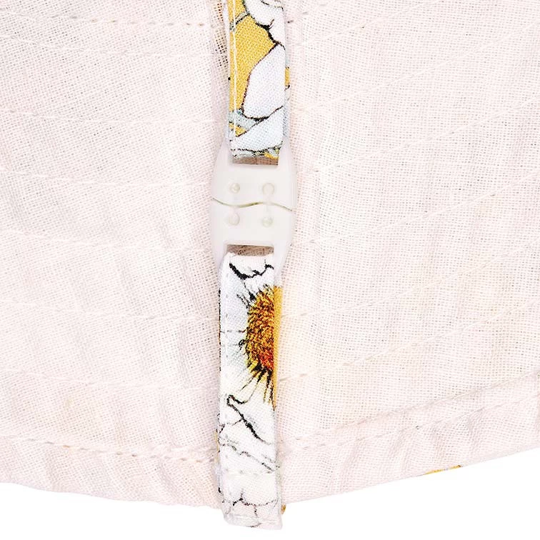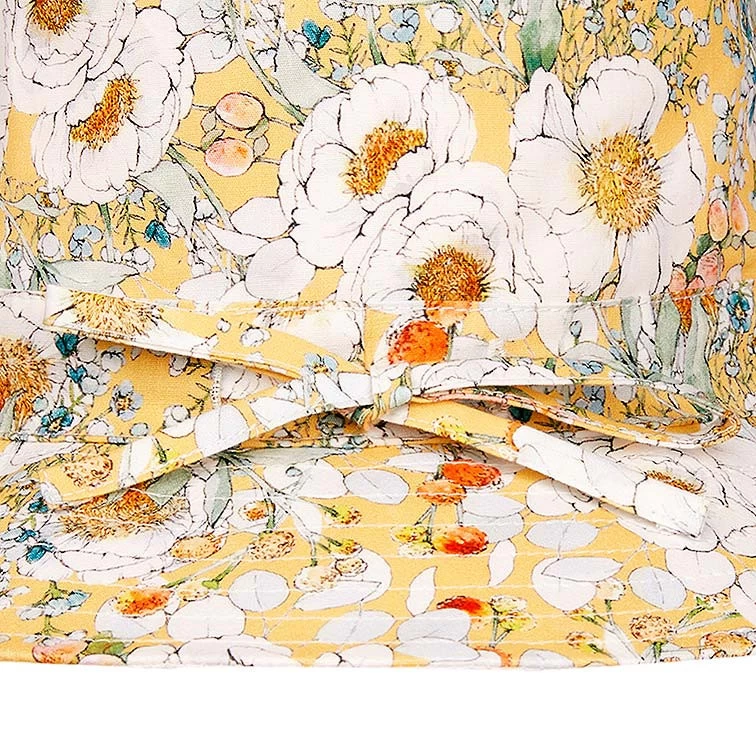 Toshi presents the classic Sunhat Claire, an ideal sunhat for children of all ages. The broad and well-structured brim offers increased sun protection. A head tie creates adjustable sizing and the chin tie with toggle secures the hat and offers ease of wear. The security release clasp on the chin tie is designed to enhance wearer safety. Sunhat Claire is crafted from the finest quality 100% cotton and is fully lined for additional comfort. Sunhat Claire Sunny features the original and exclusive, signature design of the season; an abundance of native florals and Eucalyptus leaves are presented in a vivid yellow hue.