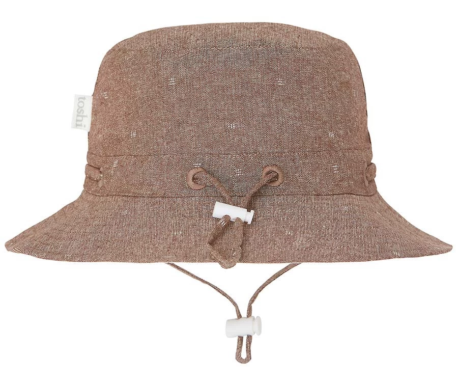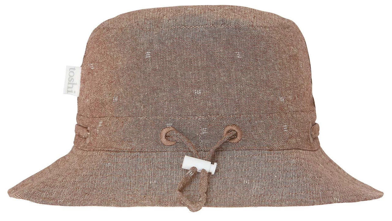Toshi presents Sunhat Lawrence, a classic sunhat for children of all ages. The broad and well-structured brim offers increased sun protection. A head toggle creates adjustable sizing and the chin tie with toggle secures the hat and offers ease of wear. The security release clasp on the chin tie is designed to enhance wearer safety. Sunhat Lawrence is crafted from a highly durable, cotton and linen blend, chambray fabric. The sunhat is fully lined for additional comfort. Sunhat Lawrence Chestnut features a subtle and refined print design in a rich and earthy dark brown hue.