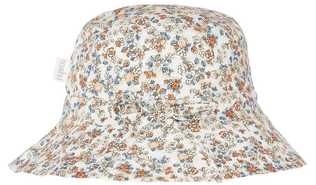Toshi presents the classic Sunhat Libby, an ideal sunhat for children of all ages. The broad and well-structured brim offers increased sun protection. A head tie creates adjustable sizing and the chin tie with toggle secures the hat and offers ease of wear. The security release clasp on the chin tie is designed to enhance wearer safety. Sunhat Libby is crafted from the finest quality 100% cotton and is fully lined for additional comfort. Sunhat Libby Lilly features a delicate and petite vintage inspired floral design.