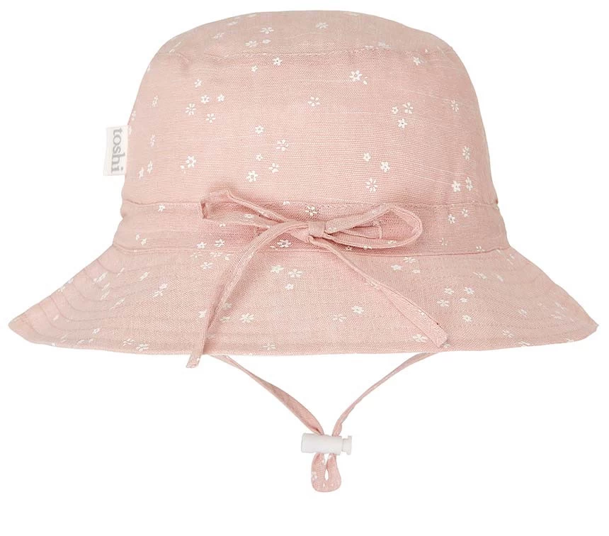 Toshi presents the classic Sunhat Milly, an ideal sunhat for children of all ages. The broad and well-structured brim offers increased sun protection. A head tie creates adjustable sizing and the chin tie with toggle secures the hat and offers ease of wear. The security release clasp on the chin tie is designed to enhance wearer safety. Sunhat Milly is crafted from the finest quality, textured 100% cotton and is fully lined for additional comfort. Sunhat Milly Misty Rose features a classically subtle floral design in a dusty pink hue.