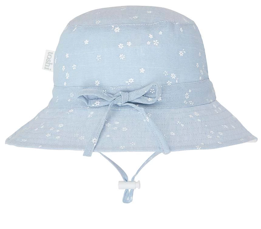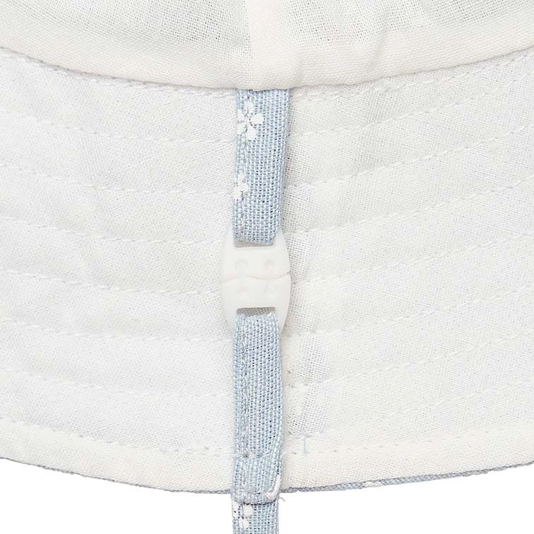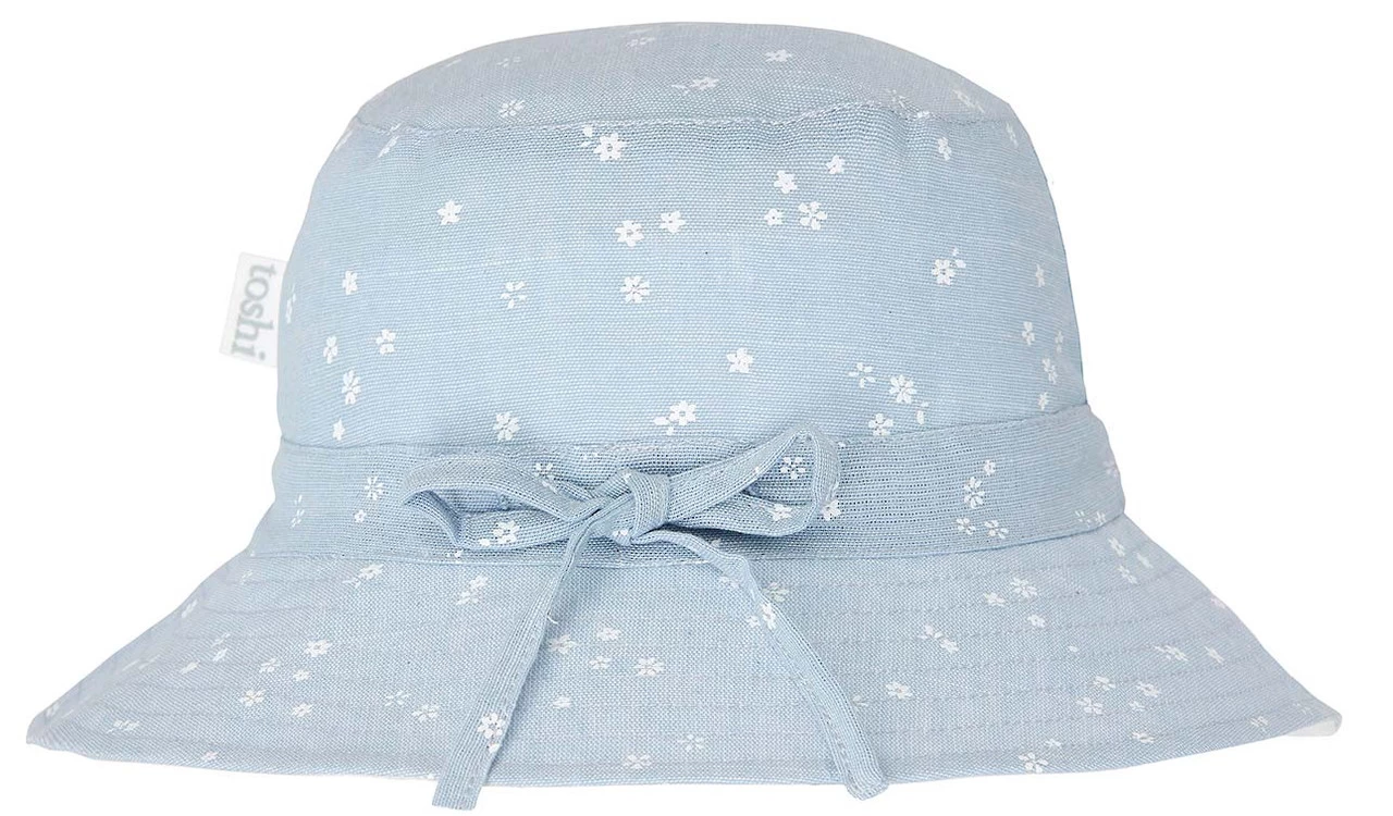 Toshi presents the classic Sunhat Milly, an ideal sunhat for children of all ages. The broad and well-structured brim offers increased sun protection. A head tie creates adjustable sizing and the chin tie with toggle secures the hat and offers ease of wear. The security release clasp on the chin tie is designed to enhance wearer safety. Sunhat Milly is crafted from the finest quality, textured 100% cotton and is fully lined for additional comfort. Sunhat Milly Sky features a classically subtle floral design in a baby blue hue.