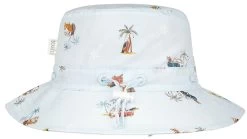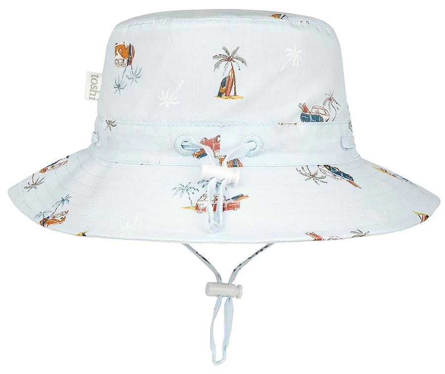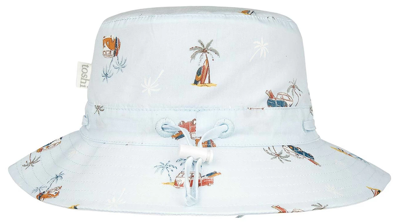 Toshi presents Sunhat Playtime, a classic sunhat for children of all ages. The broad and well-structured brim offers increased sun protection. A head toggle creates adjustable sizing and the chin tie with toggle secures the hat and offers ease of wear. The security release clasp on the chin tie is designed to enhance wearer safety. Sunhat Playtime is crafted from the finest quality 100% cotton and is fully lined for additional comfort. Sunhat Playtime Beach Bums presents in an original and exclusive print design, featuring a vintage inspired surfing safari in an ocean blue hue.