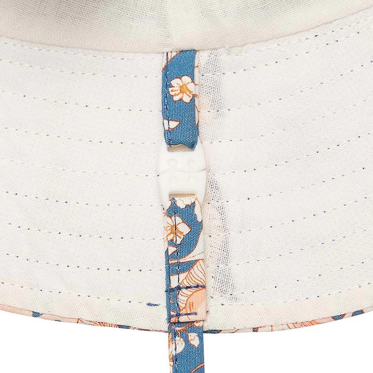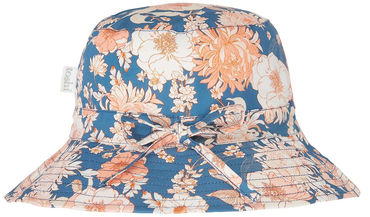 Toshi presents the classic Sunhat Sabrina, an ideal sunhat for children of all ages. The broad and well-structured brim offers increased sun protection. A head tie creates adjustable sizing and the chin tie with toggle secures the hat and offers ease of wear. The security release clasp on the chin tie is designed to enhance wearer safety. Sunhat Sabrina is crafted from the finest quality 100% cotton and is fully lined for additional comfort. Sabrina Midnight features a bold vintage floral design in a French navy colour palette.