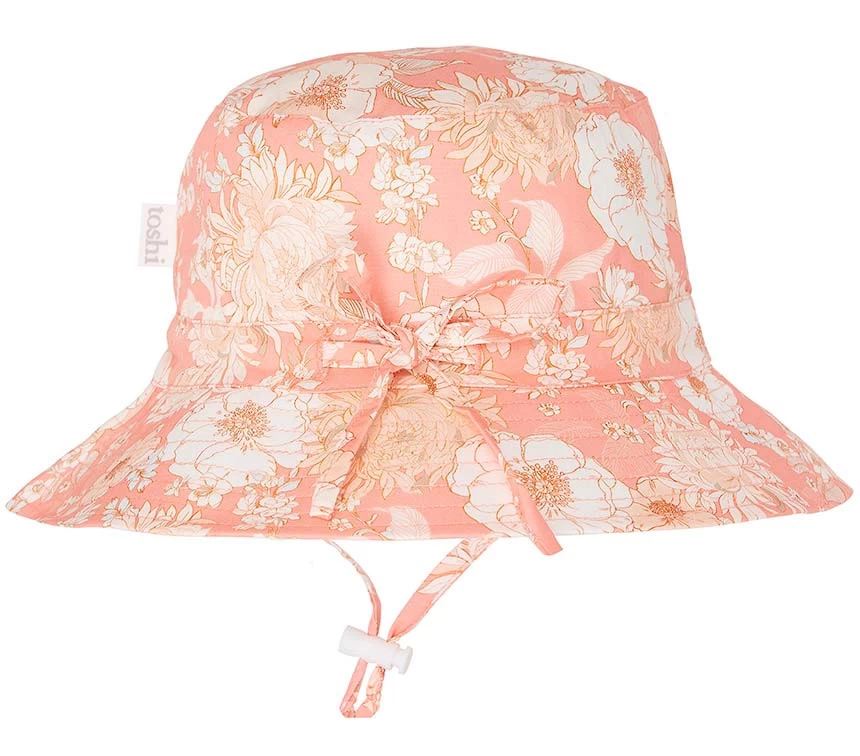Toshi presents the classic Sunhat Sabrina, an ideal sunhat for children of all ages. The broad and well-structured brim offers increased sun protection. A head tie creates adjustable sizing and the chin tie with toggle secures the hat and offers ease of wear. The security release clasp on the chin tie is designed to enhance wearer safety. Sunhat Sabrina is crafted from the finest quality 100% cotton and is fully lined for additional comfort. Sabrina Tea Rose features a bold vintage floral design in a rose pink colour palette.