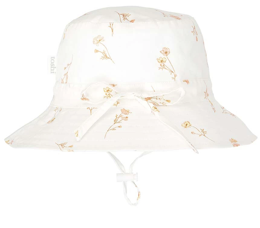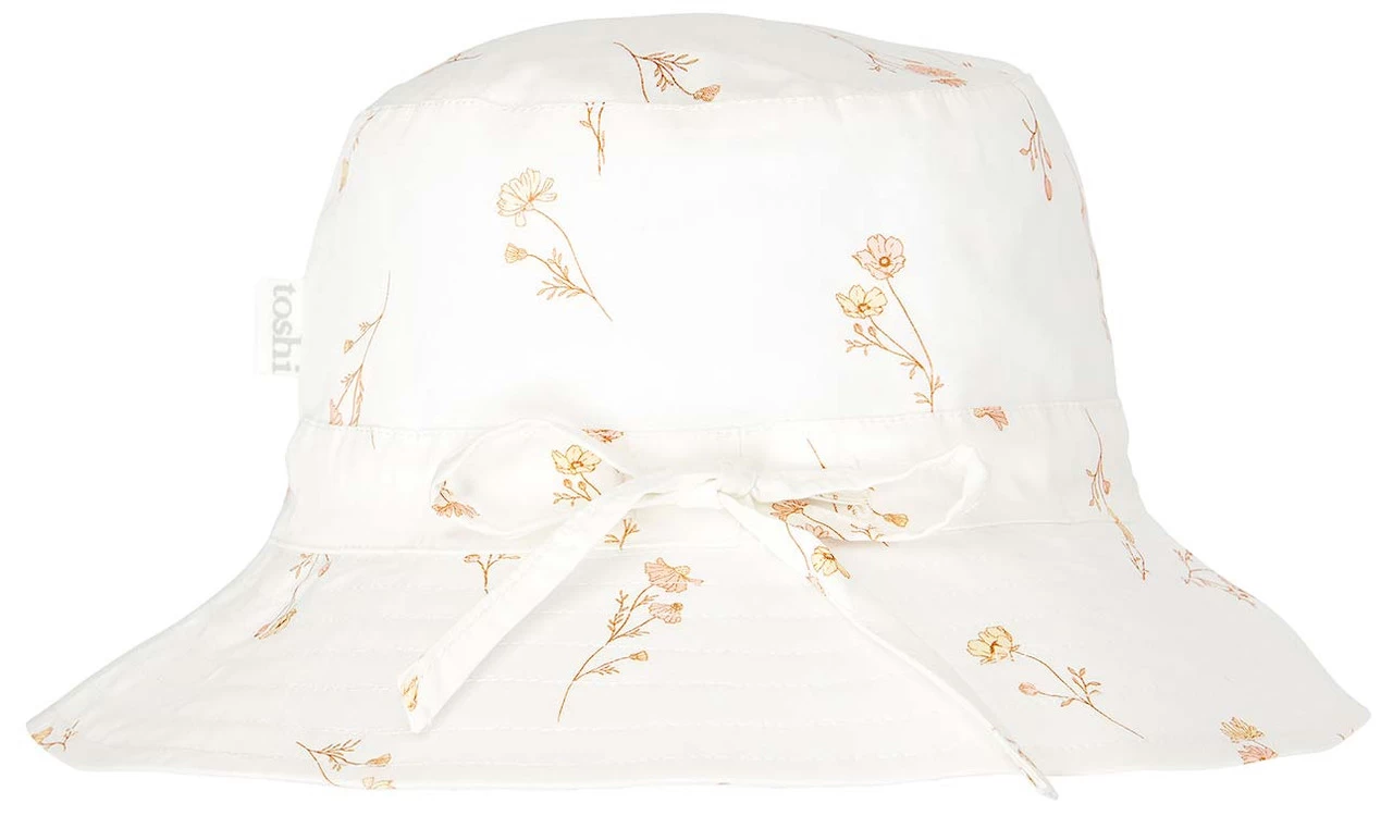 Toshi presents the classic Sunhat Willow, an ideal sunhat for children of all ages. The broad and well-structured brim offers increased sun protection. A head tie creates adjustable sizing and the chin tie with toggle secures the hat and offers ease of wear. The security release clasp on the chin tie is designed to enhance wearer safety. Sunhat Willow is crafted from the finest quality 100% cotton and is fully lined for additional comfort. Sunhat Willow Lilly presents a classically minimal floral design of light and gently floating sprigs and petite blossoms.