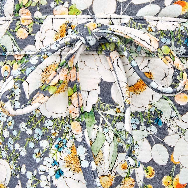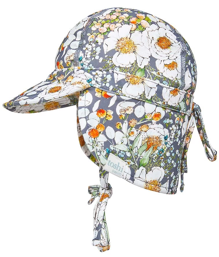 Toshi Swim Flap Cap Claire features the original and exclusive, signature design of the season; an abundance of native florals and Eucalyptus leaves are presented in a classic French navy hue.