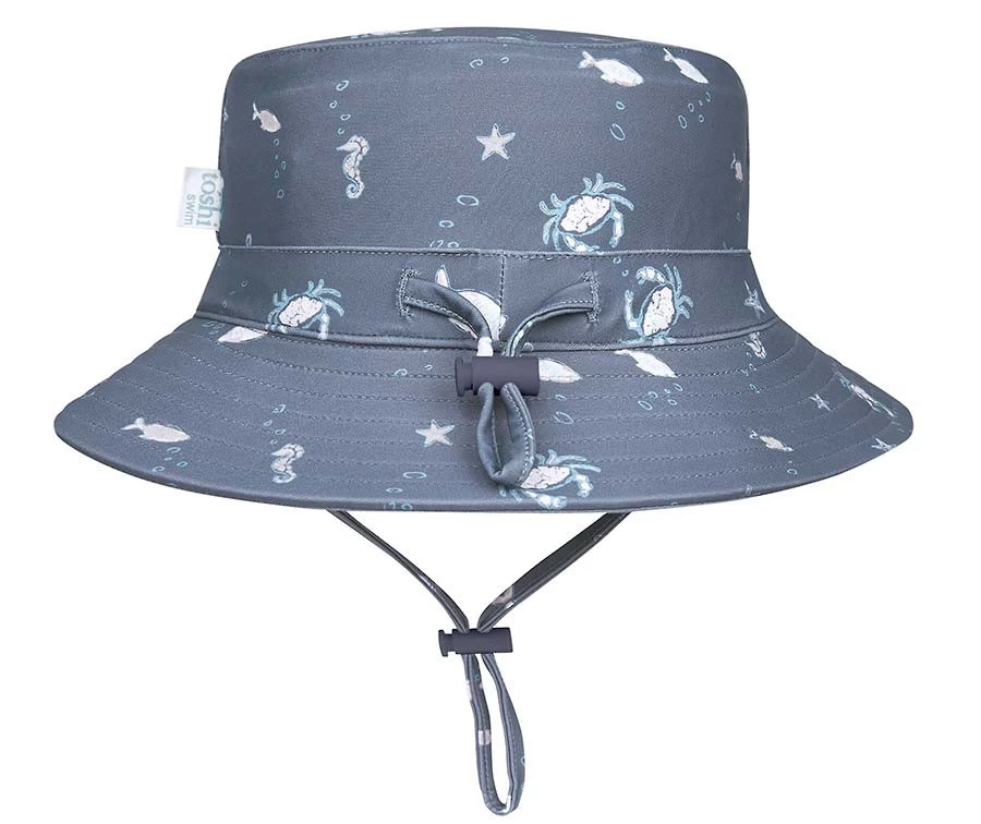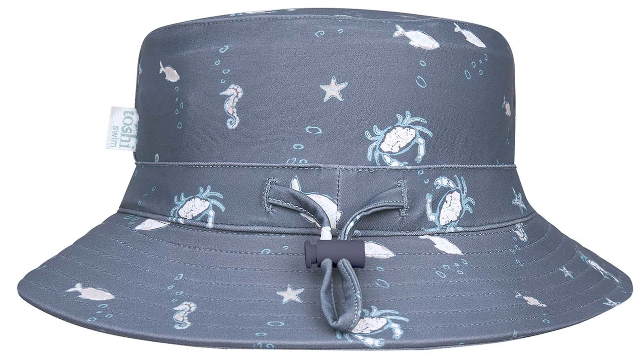Toshi Swim Sunhat Neptune features an original and exclusive Toshi print design; a school of fish and their rock pool friends are presented in a classic deep navy blue hue.