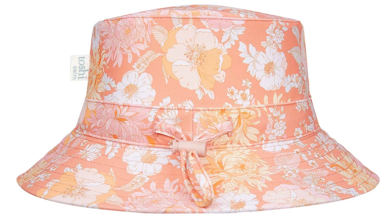 Toshi Swim Sunhat Tea Rose features an original and exclusive Toshi print design; a whimsical vintage floral is presented in a vivid rose pink hue.